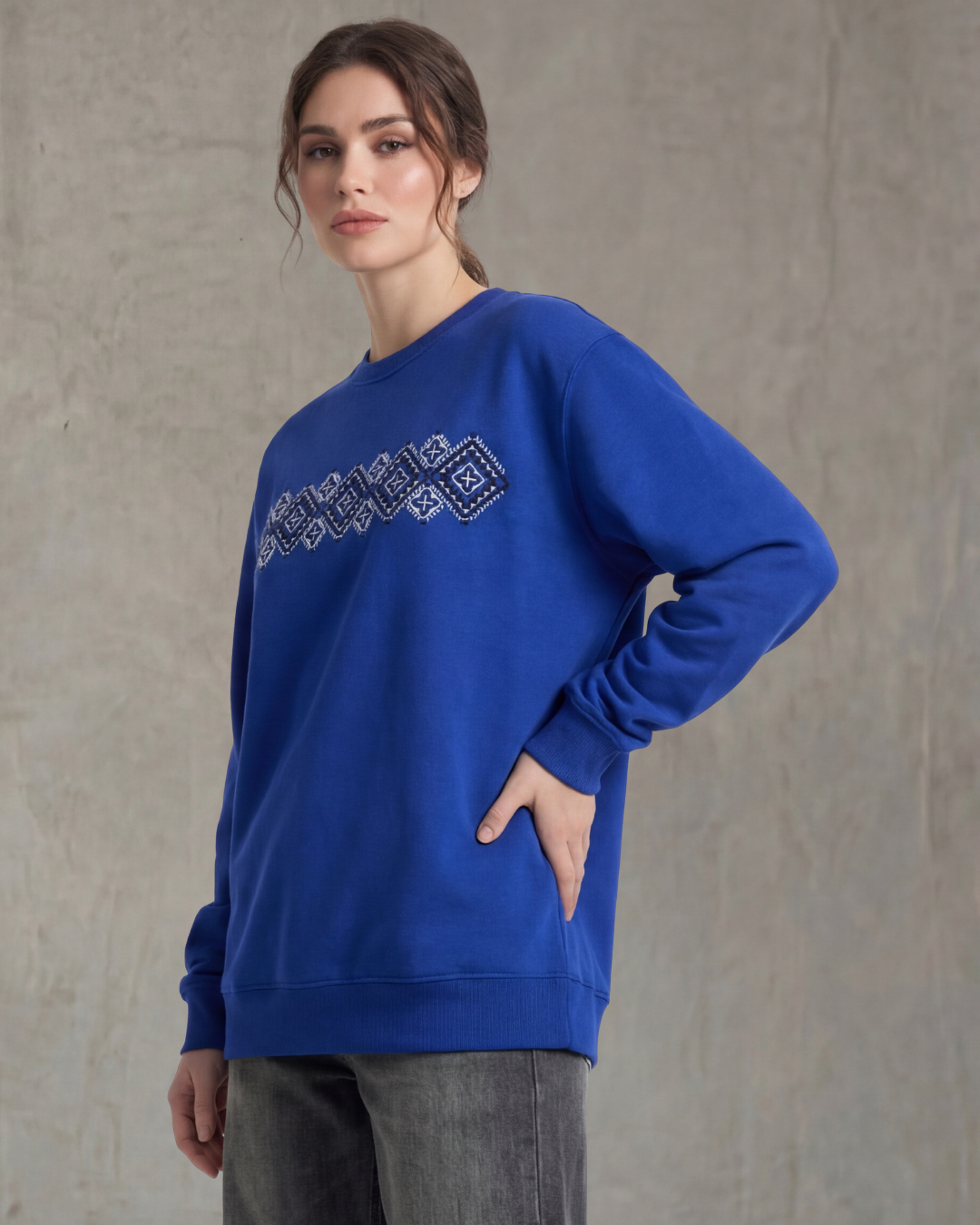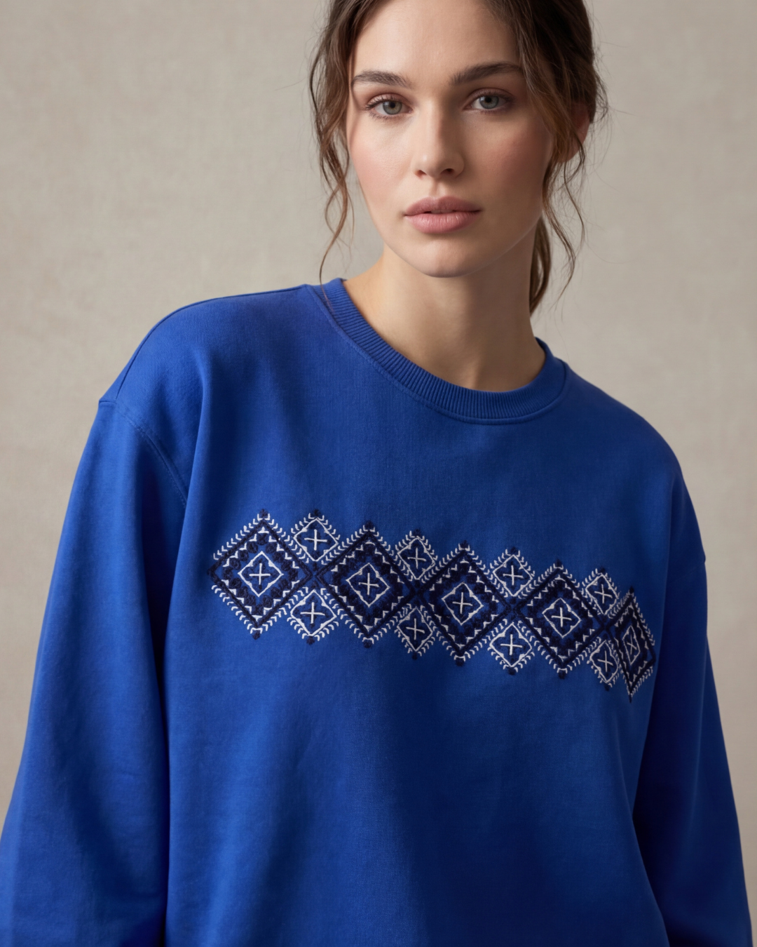 Design details: This crew-neck pullover serves as a bold statement piece, characterized by its striking cobalt blue base and a meticulously detailed horizontal embroidery band across the chest. The pattern features a rhythmic sequence of diamond motifs, blending traditional geometric artistry with a clean, contemporary silhouette. The embroidery uses a high-contrast palette of white and navy thread, creating a textured, 3D effect that elevates the garment from a simple basic to a premium wardrobe essential. Designed with ribbed cuffs and a reinforced hem, it maintains its shape even after multiple wears.