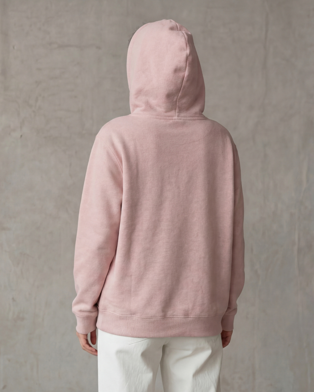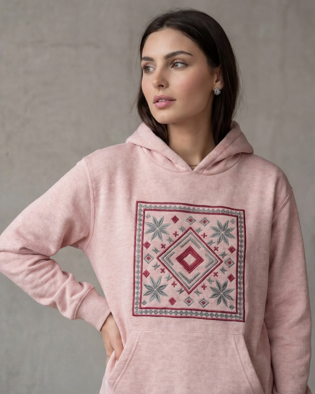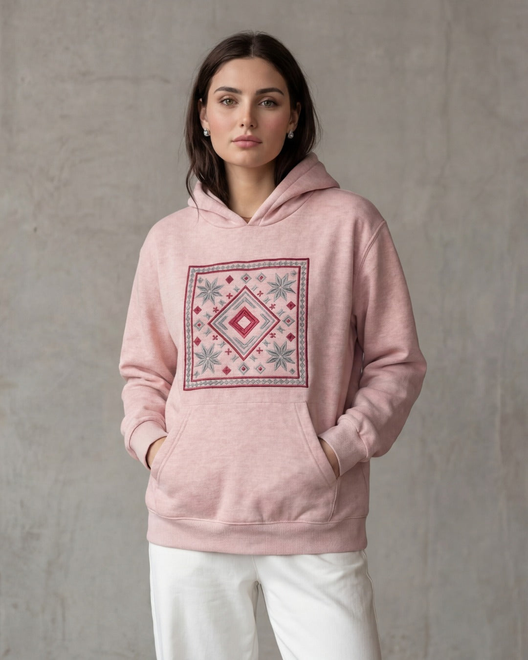 Design details: This hoodie brings a touch of warmth to the winter season with its beautiful dusty rose heathered fabric. At its center lies an intricate, large-scale square embroidery that draws inspiration from heritage tapestry patterns. The artwork combines starbursts, cross-stitches, and diamond centers in a sophisticated palette of slate grey and deep burgundy. The embroidery is framed by a solid border, giving it a structured, "badge-like" appearance that commands attention. Finished with a cozy kangaroo pocket and ribbed trimmings, it’s the perfect blend of bohemian charm and contemporary street style.